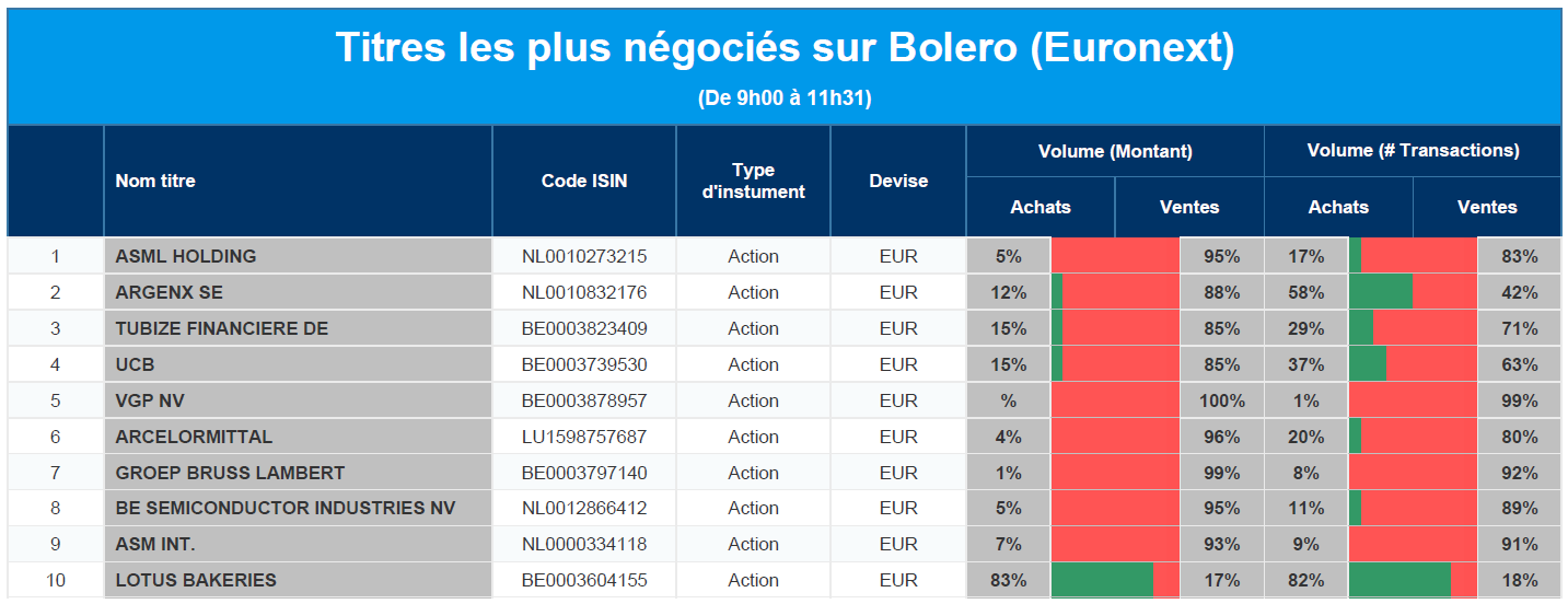 Chaque jour, nous vous offrons un aperçu des titres les plus négociés chez Bolero sur Euronext. Idéal pour prendre la température du marché boursier et pour découvrir les actions ou les titres que les autres investisseurs s'arrachent !
