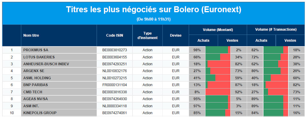 Chaque jour, nous vous offrons un aperçu des titres les plus négociés chez Bolero sur Euronext. Idéal pour prendre la température du marché boursier et pour découvrir les actions ou les titres que les autres investisseurs s'arrachent !