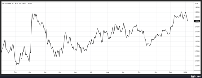 Ce recul de l’inflation, et le sentiment que la BCE n’augmentera pas ses taux avant 2027 expliquent le recul du rendement du Bund 10 ans.