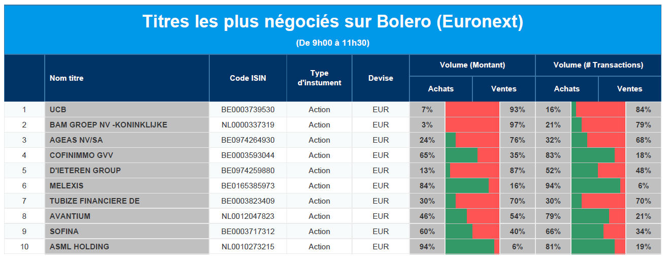 Chaque jour, nous vous offrons un aperçu des titres les plus négociés chez Bolero sur Euronext. Idéal pour prendre la température du marché boursier et pour découvrir les actions ou les titres que les autres investisseurs s'arrachent !
