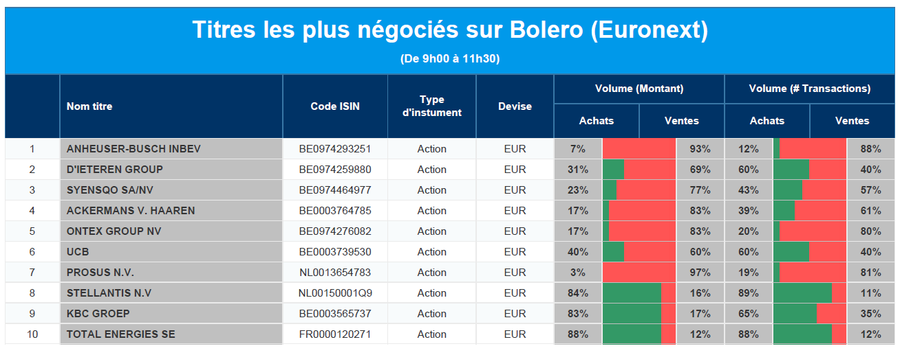 Chaque jour, nous vous offrons un aperçu des titres les plus négociés chez Bolero sur Euronext. Idéal pour prendre la température du marché boursier et pour découvrir les actions ou les titres que les autres investisseurs s'arrachent !