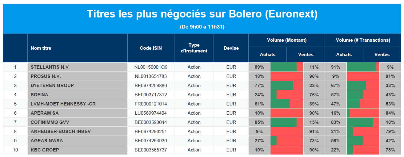 Chaque jour, nous vous offrons un aperçu des titres les plus négociés chez Bolero sur Euronext. Idéal pour prendre la température du marché boursier et pour découvrir les actions ou les titres que les autres investisseurs s'arrachent !