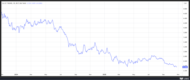 Cet après-midi, la Banque centrale du Canada abaissera également son taux de 0,25 % pour le ramener à 2,25 %, niveau proche du taux neutre, ce qui explique le niveau actuel du rendement de l’obligation canadienne à 2 ans.