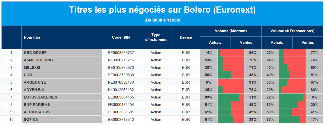 Chaque jour, nous vous offrons un aperçu des titres les plus négociés chez Bolero sur Euronext. Idéal pour prendre la température du marché boursier et pour découvrir les actions ou les titres que les autres investisseurs s'arrachent !
