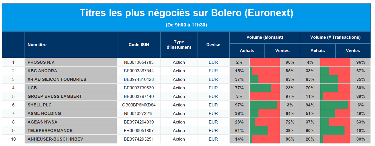 Chaque jour, nous vous offrons un aperçu des titres les plus négociés chez Bolero sur Euronext. Idéal pour prendre la température du marché boursier et pour découvrir les actions ou les titres que les autres investisseurs s'arrachent !