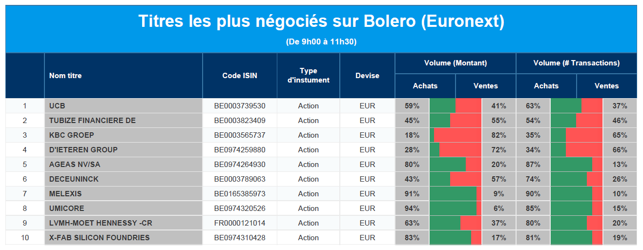 Chaque jour, nous vous offrons un aperçu des titres les plus négociés chez Bolero sur Euronext. Idéal pour prendre la température du marché boursier et pour découvrir les actions ou les titres que les autres investisseurs s'arrachent !