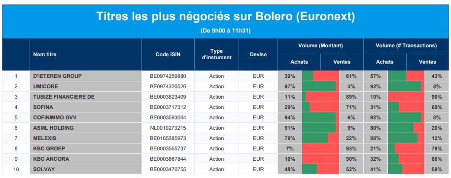 Chaque jour, nous vous offrons un aperçu des titres les plus négociés chez Bolero sur Euronext. Idéal pour prendre la température du marché boursier et pour découvrir les actions ou les titres que les autres investisseurs s'arrachent !