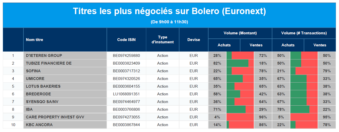 Chaque jour, nous vous offrons un aperçu des titres les plus négociés chez Bolero sur Euronext. Idéal pour prendre la température du marché boursier et pour découvrir les actions ou les titres que les autres investisseurs s'arrachent !