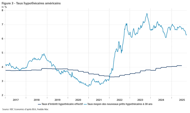 Les taux d’intérêt élevés ont rendu l’achat d’un nouveau logement prohibitif pour les candidats à l’accession à la propriété. Dans le même temps, les propriétaires actuels hésitaient à vendre leur maison pour en acheter une nouvelle, car nombre d’entre eux avaient refinancé leur prêt hypothécaire pendant la pandémie à des taux bas. La vente de leur logement les obligerait à refinancer leur prêt hypothécaire à un taux beaucoup moins favorable (voir également notre avis économique de novembre 2023). Pourtant, aujourd’hui, une grande partie des ménages bénéficient de taux hypothécaires plus bas. Le taux d’intérêt hypothécaire effectif était de 4,1 % au deuxième trimestre 2025, ce qui est encore bien inférieur au taux des nouveaux prêts hypothécaires. Selon une étude menée par Realtor, un site d’annonces immobilières, 72,1 % des détenteurs de prêts hypothécaires avaient encore un taux d’intérêt impayé inférieur à 5 % au quatrième trimestre 2024. 20,9 % paient encore des taux hypothécaires inférieurs à 3 %. Lentement mais sûrement, les contrats de prêts hypothécaires à taux bas se terminent et davantage de propriétaires pourraient être incités à vendre leur maison. Cela pourrait accroître l’offre sur le marché et exercer une nouvelle pression à la baisse sur les prix.