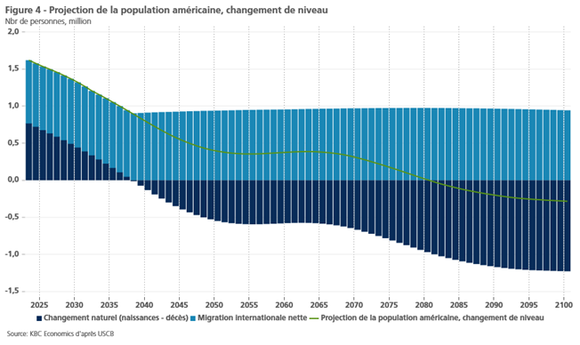 Un autre facteur influençant les prix est la croissance démographique. Bien que les États-Unis aient des perspectives démographiques plus favorables que beaucoup d’autres pays développés, leur croissance démographique devrait ralentir. Le Census Bureau prévoit un ralentissement progressif de la croissance démographique, qui devrait passer de 0,5 % en 2023 à -0,1 % d’ici la fin du siècle (voir figure 4). Ces prévisions n’intègrent toutefois pas la récente répression de l’administration Trump en matière d’immigration. Selon le BLS, la population née à l’étranger a diminué de 310 000 personnes en glissement annuel en août. Le financement du contrôle de l’immigration ayant été drastiquement augmenté (voir également notre rapport de recherche du 16 septembre), de nouvelles baisses des migrations sont à prévoir.