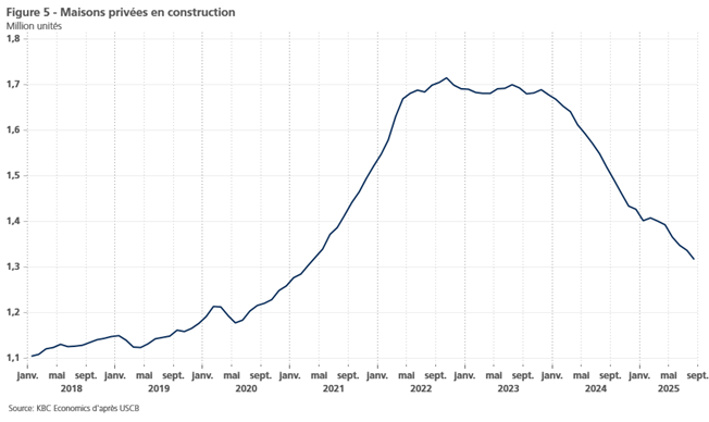 La situation du marché du logement a des implications importantes pour l’économie américaine, car la construction de bâtiments et les activités immobilières représentent 15,6 % de la valeur ajoutée brute des États-Unis. Les investissements résidentiels ont pesé sur l’économie depuis que les taux ont commencé à augmenter en 2022. En termes réels, ils étaient plus bas au deuxième trimestre 2025 qu’avant la pandémie (au premier trimestre 2020) et sont inférieurs de 14,6 % au pic du premier trimestre 2021. Les indicateurs de sentiment indiquent que les investissements résidentiels continueront probablement à peser sur l’économie. L’indicateur de confiance des constructeurs de logements de la NAHB est tombé à 32 en août, un niveau plancher qui n’avait pas été atteint depuis décembre 2022.