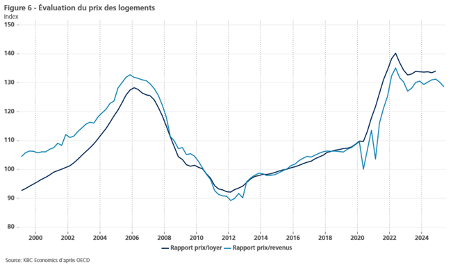 À court terme, le marché est toutefois bien approvisionné. Les stocks de logements ont considérablement augmenté. En juin, le rapport entre les maisons à vendre et les maisons vendues a atteint 9,8, contre 8,4 en juin 2024. L’offre de nouveaux logements ralentit toutefois, le nombre de maisons en construction étant en baisse (voir figure 5). Il reste toutefois supérieur aux niveaux d’avant la crise.