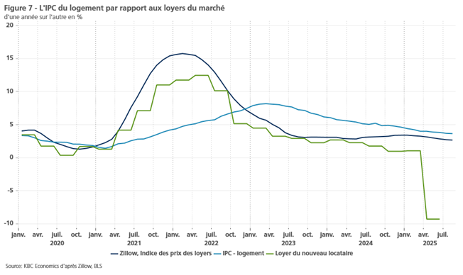La baisse des prix de l’immobilier est toutefois une bonne nouvelle sur le front de l’inflation. La baisse des prix des logements exercera une influence sur les prix des loyers. L’inflation des prix des loyers s’est modérée ces derniers mois (voir figure 7). Les indicateurs prospectifs indiquent une poursuite de la modération de l’inflation des loyers. La forte baisse du nombre de nouveaux locataires est particulièrement encourageante pour l’inflation des loyers à court terme. Étant donné que les prix du logement représentent 35 % du panier total de l’IPC, une modération de l’inflation du logement a des implications importantes pour l’inflation globale. Pour l’inflation PCE (la mesure préférée de la Fed), où le logement n’a qu’un poids de 15 %, la modération des loyers aura un impact plus faible, même s’il reste significatif.
