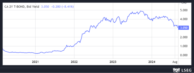 Le taux canadien à 2 ans a reculé après ces chiffres dans la perspective de prochaines baisses de taux qui pourraient bien s’accélérer.