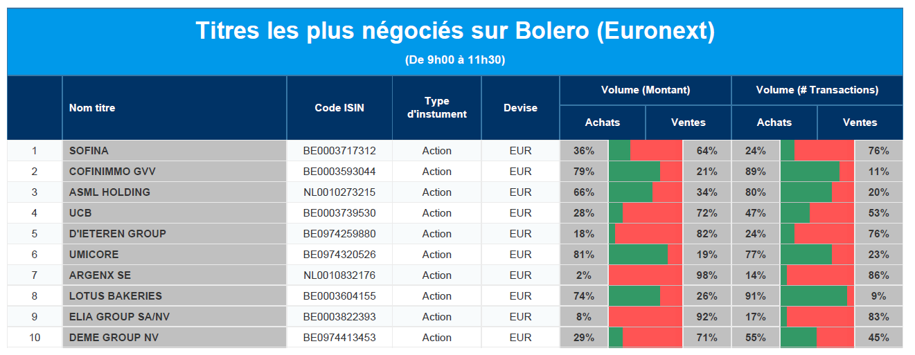 Chaque jour, nous vous offrons un aperçu des titres les plus négociés chez Bolero sur Euronext. Idéal pour prendre la température du marché boursier et pour découvrir les actions ou les titres que les autres investisseurs s'arrachent !