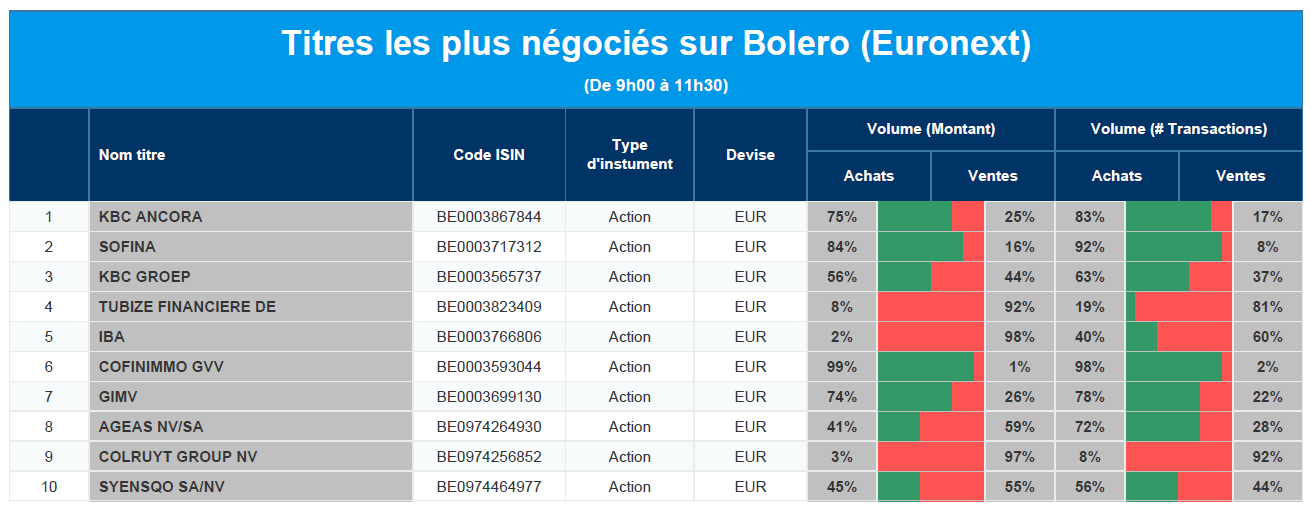 Chaque jour, nous vous offrons un aperçu des titres les plus négociés chez Bolero sur Euronext. Idéal pour prendre la température du marché boursier et pour découvrir les actions ou les titres que les autres investisseurs s'arrachent !