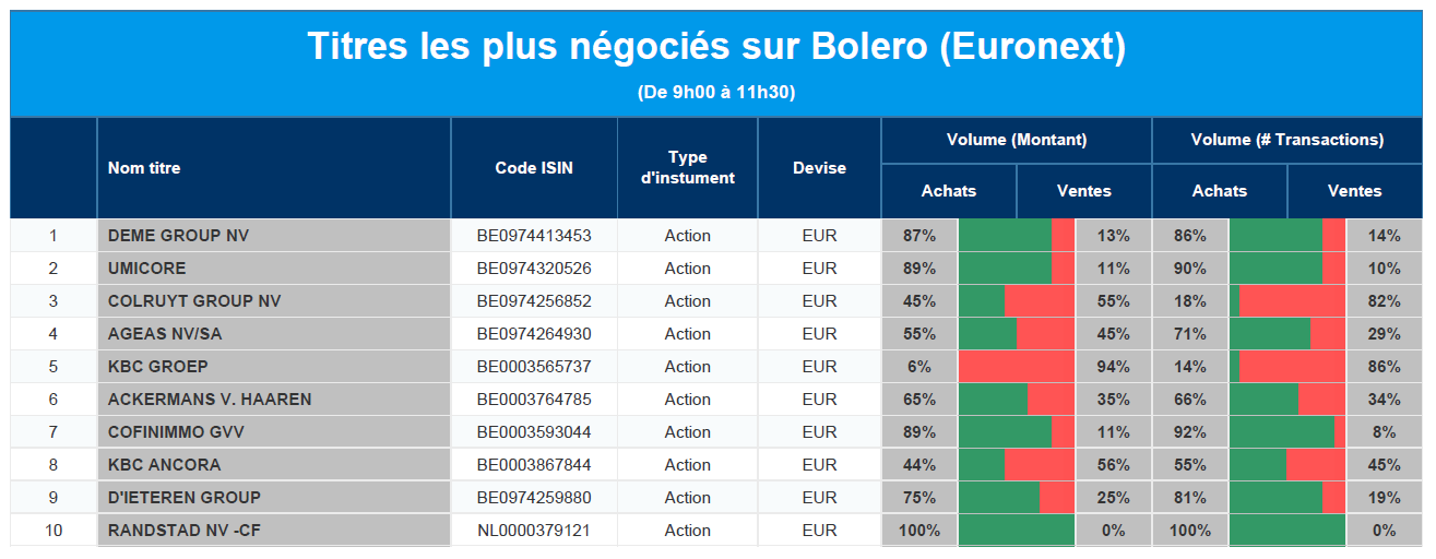 Chaque jour, nous vous offrons un aperçu des titres les plus négociés chez Bolero sur Euronext. Idéal pour prendre la température du marché boursier et pour découvrir les actions ou les titres que les autres investisseurs s'arrachent !