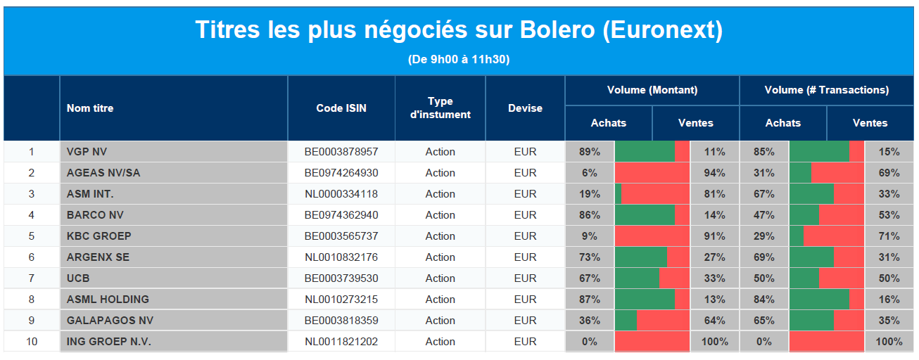 Chaque jour, nous vous offrons un aperçu des titres les plus négociés chez Bolero sur Euronext. Idéal pour prendre la température du marché boursier et pour découvrir les actions ou les titres que les autres investisseurs s'arrachent !