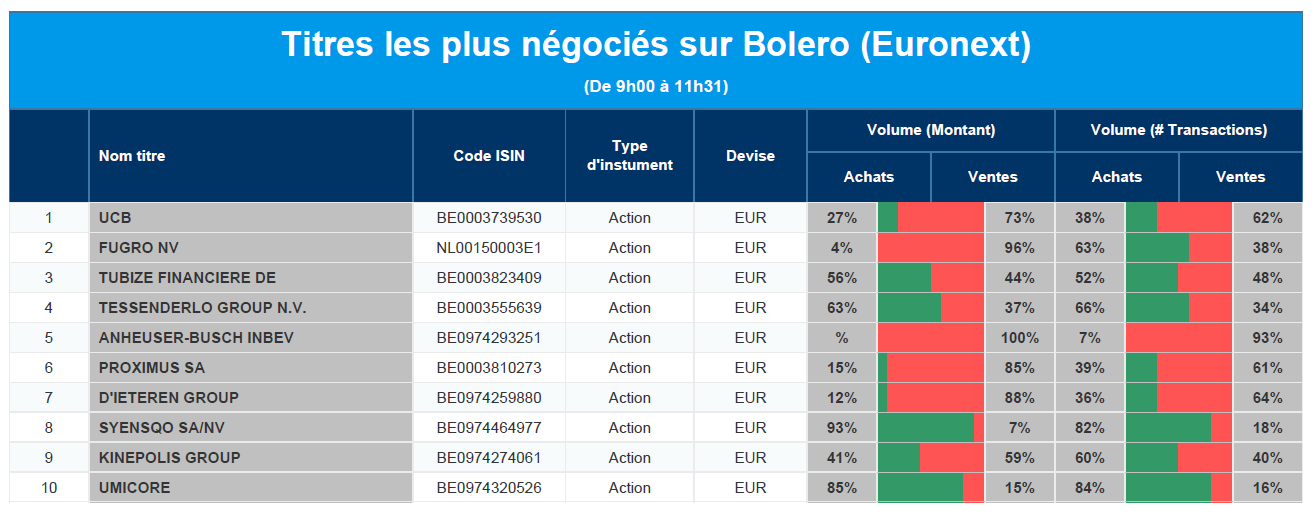 Chaque jour, nous vous offrons un aperçu des titres les plus négociés chez Bolero sur Euronext. Idéal pour prendre la température du marché boursier et pour découvrir les actions ou les titres que les autres investisseurs s'arrachent !