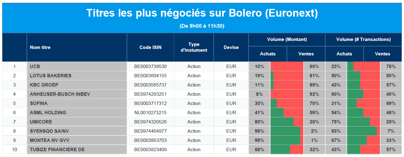 Chaque jour, nous vous offrons un aperçu des titres les plus négociés chez Bolero sur Euronext. Idéal pour prendre la température du marché boursier et pour découvrir les actions ou les titres que les autres investisseurs s'arrachent !