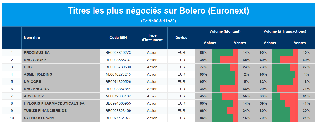 Chaque jour, nous vous offrons un aperçu des titres les plus négociés chez Bolero sur Euronext. Idéal pour prendre la température du marché boursier et pour découvrir les actions ou les titres que les autres investisseurs s'arrachent !