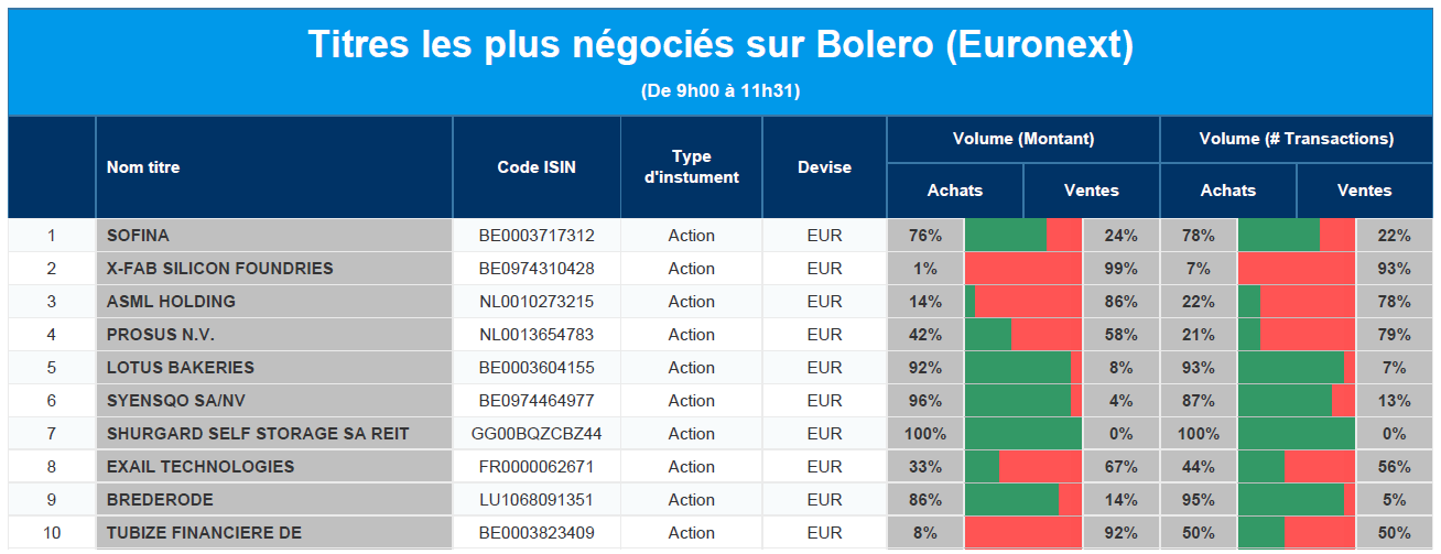 Chaque jour, nous vous offrons un aperçu des titres les plus négociés chez Bolero sur Euronext. Idéal pour prendre la température du marché boursier et pour découvrir les actions ou les titres que les autres investisseurs s'arrachent !