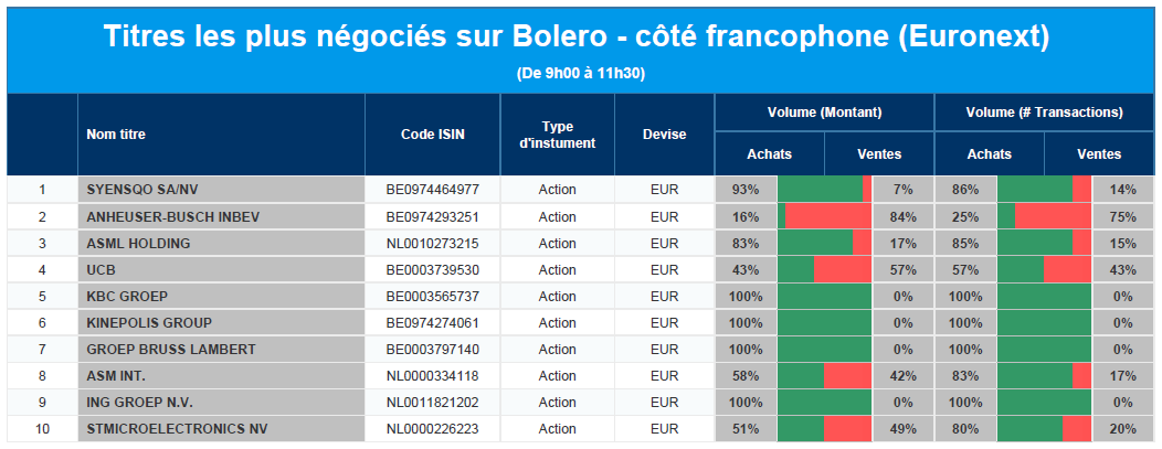 Chaque jour, nous vous offrons un aperçu des titres les plus négociés chez Bolero sur Euronext. Idéal pour prendre la température du marché boursier et pour découvrir les actions ou les titres que les autres investisseurs s'arrachent !