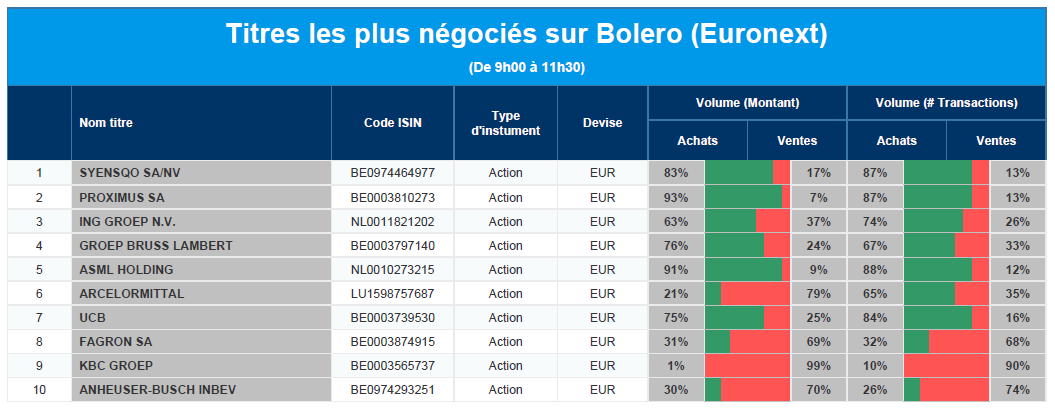Chaque jour, nous vous offrons un aperçu des titres les plus négociés chez Bolero sur Euronext. Idéal pour prendre la température du marché boursier et pour découvrir les actions ou les titres que les autres investisseurs s'arrachent !