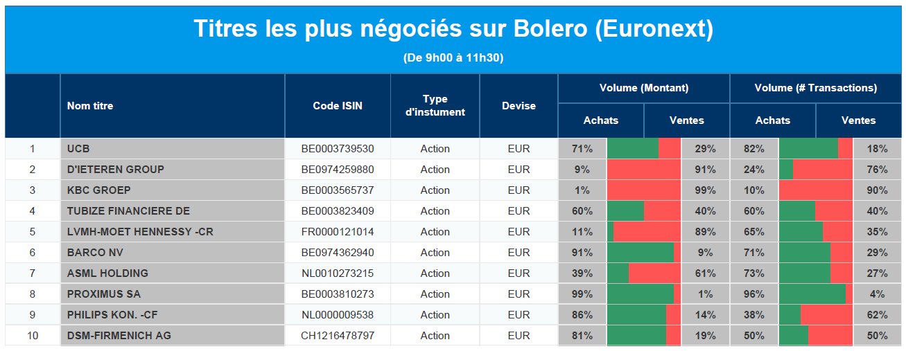 Chaque jour, nous vous offrons un aperçu des titres les plus négociés chez Bolero sur Euronext. Idéal pour prendre la température du marché boursier et pour découvrir les actions ou les titres que les autres investisseurs s'arrachent !