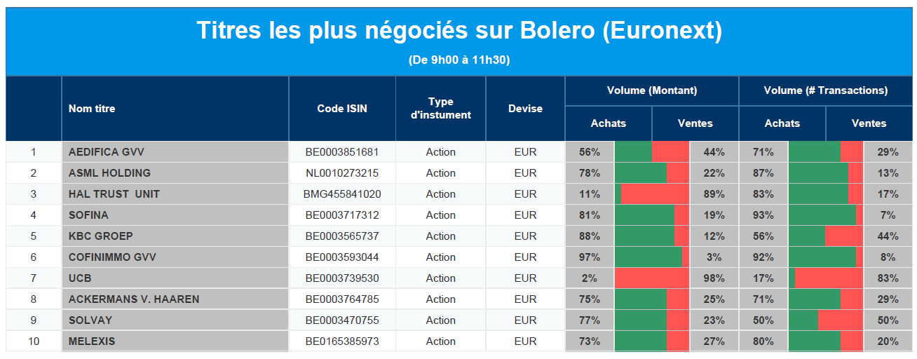 Chaque jour, nous vous offrons un aperçu des titres les plus négociés chez Bolero sur Euronext. Idéal pour prendre la température du marché boursier et pour découvrir les actions ou les titres que les autres investisseurs s'arrachent !