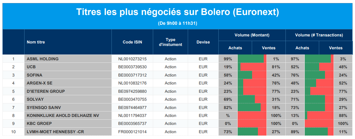 Chaque jour, nous vous offrons un aperçu des titres les plus négociés chez Bolero sur Euronext. Idéal pour prendre la température du marché boursier et pour découvrir les actions ou les titres que les autres investisseurs s'arrachent !