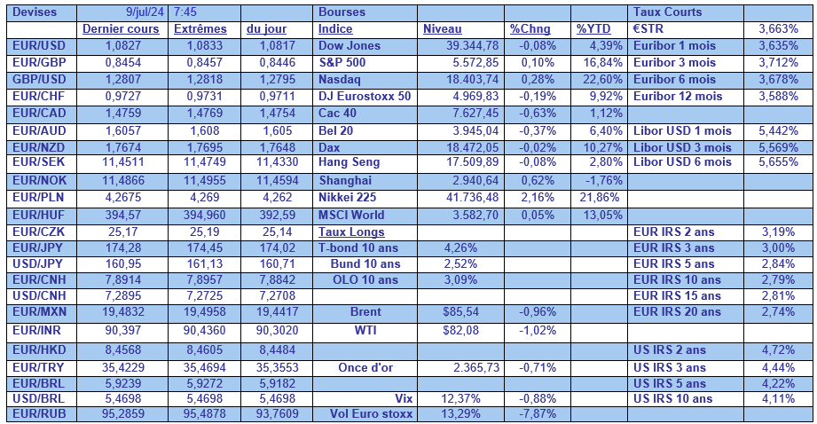 Aux Etats-Unis, on attend, aujourd’hui, le testimony de Powell devant le Congrès, ainsi que le chiffre d’inflation, qui sera publié jeudi, pour avoir une confirmation que la baisse des taux approche.