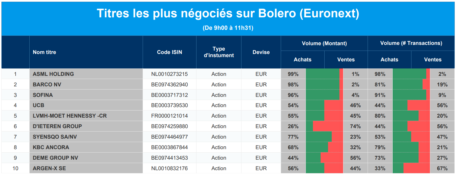 Chaque jour, nous vous offrons un aperçu des titres les plus négociés chez Bolero sur Euronext. Idéal pour prendre la température du marché boursier et pour découvrir les actions ou les titres que les autres investisseurs s'arrachent !