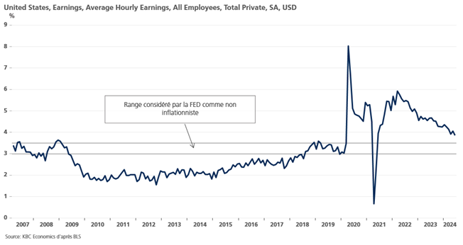 Et donnée très positive pour la FED, le salaire horaire moyen a augmenté de 0.3% d’un mois à l’autre, soit un taux annuel de 3.9%, qui se rapproche doucement du niveau compatible avec l’objectif d’inflation.