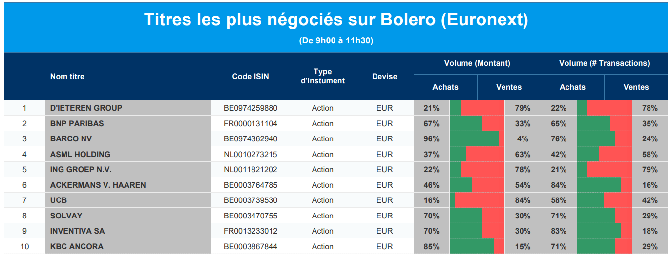 Chaque jour, nous vous offrons un aperçu des titres les plus négociés chez Bolero sur Euronext. Idéal pour prendre la température du marché boursier et pour découvrir les actions ou les titres que les autres investisseurs s'arrachent !