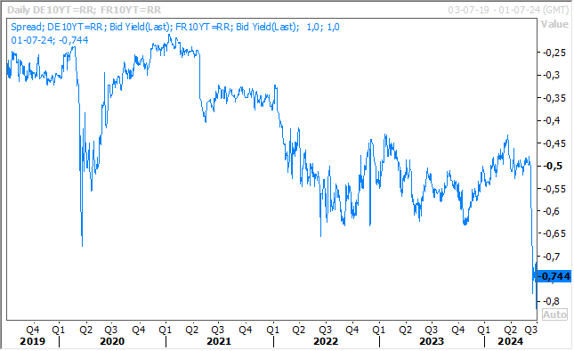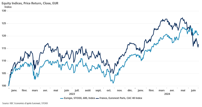 Soulagement dans les marchés financiers de ne pas voir le Front populaire avoir la majorité, ni le RN, à ce stade, mais prudence, car rien ne dit qu’il ne l’aura pas au second tour, et en l’absence, que le pays se retrouve sans majorité et soit dès lors ingouvernable.