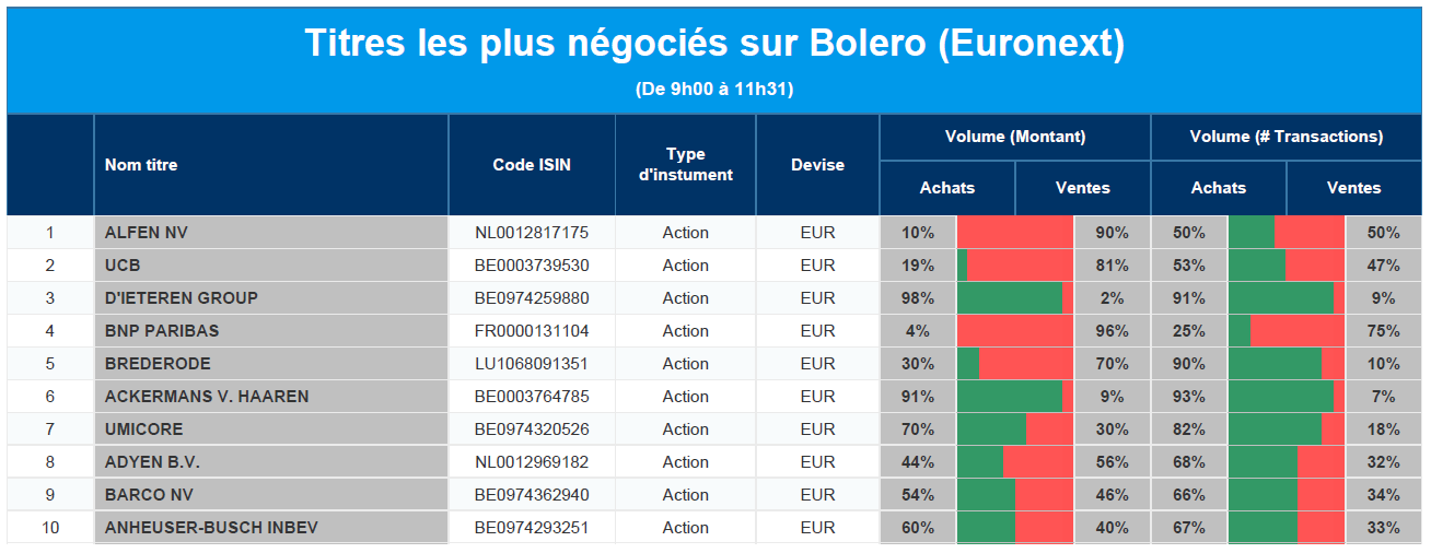 Chaque jour, nous vous offrons un aperçu des titres les plus négociés chez Bolero sur Euronext. Idéal pour prendre la température du marché boursier et pour découvrir les actions ou les titres que les autres investisseurs s'arrachent !