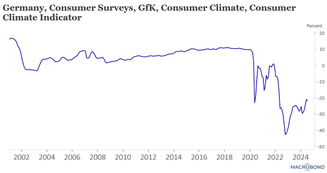 Il s’agit de l’indice GfK, qui mesure le moral des consommateurs allemands, qui affiche un léger recul, en partie lié à la remontée de l’inflation en mai qui vient plomber les perspectives de consommation.