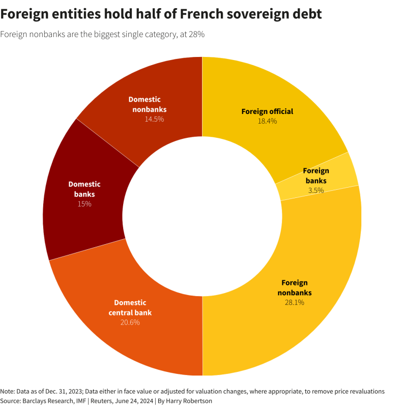 Toute la question est maintenant de savoir comment les marchés financiers vont réagir et, en particulier, le marché obligataire, en sachant que les investisseurs étrangers détiennent environ 50 % de la dette publique totale de la France, ce qui est beaucoup plus élevé que les 28 % de l’Italie, les 30 % des États-Unis, les 40 % de l’Espagne et les 45 % de l’Allemagne.