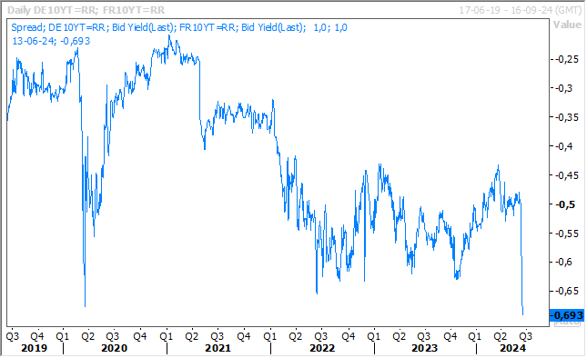 Le différentiel de taux entre le Bund et l’obligation française continue de se tendre, ce qui a comme conséquence de renchérir le coût des emprunts pour l’Etat français, qui est déjà fortement endetté.