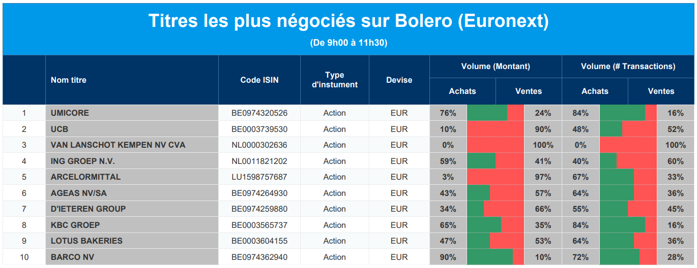 Chaque jour, nous vous offrons un aperçu des titres les plus négociés chez Bolero sur Euronext. Idéal pour prendre la température du marché boursier et pour découvrir les actions ou les titres que les autres investisseurs s'arrachent !