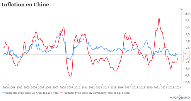 Pour ne pas arranger les choses, la demande intérieure en Chine reste trop faible, ce qui se reflète dans le niveau très faible de l’inflation. D’un mois à l’autre, l’inflation a reculé de 0,1 %, soit un taux annuel qui est resté inchangé à 0,3 %.