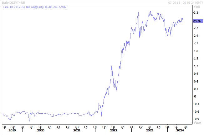 Et d’ailleurs, le marché ne s’y trompe pas quand on observe le rendement du Bund 2 ans qui se situe à 3%, n’anticipant des baisses de taux qu’à plus longue échéance.