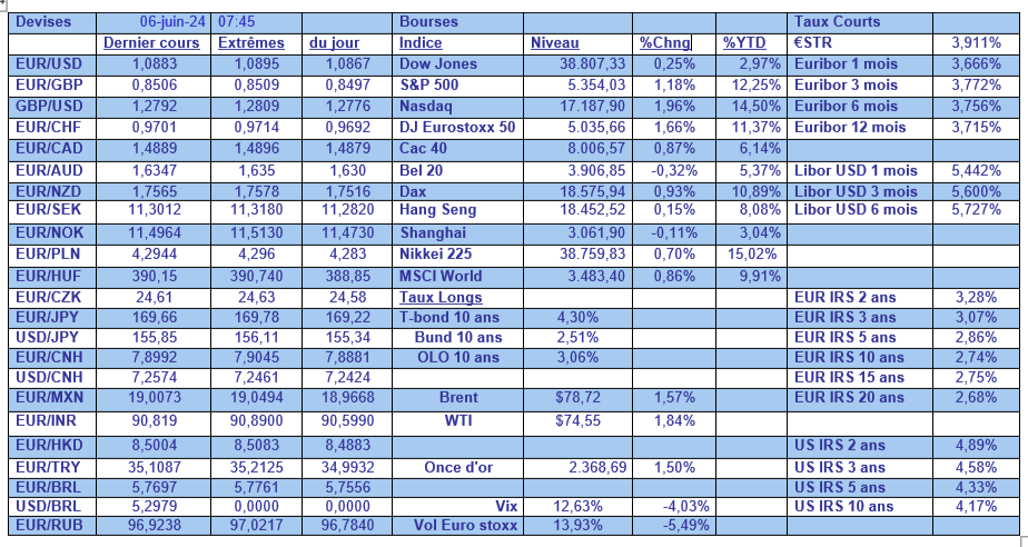 Ce rapport renforce d’autres données montrant que le marché de l’emploi est en train de se rééquilibrer, mais si le taux de chômage publié demain est confirmé à 3.9%, cela ne justifie en rien une urgence dans la baisse des taux. Le scénario actuel étant celui d’une baisse des taux en septembre et en décembre de la part de la FED.