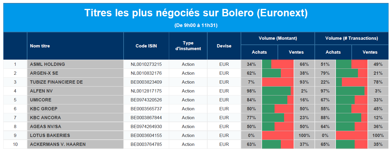 Chaque jour, nous vous offrons un aperçu des titres les plus négociés chez Bolero sur Euronext. Idéal pour prendre la température du marché boursier et pour découvrir les actions ou les titres que les autres investisseurs s'arrachent !