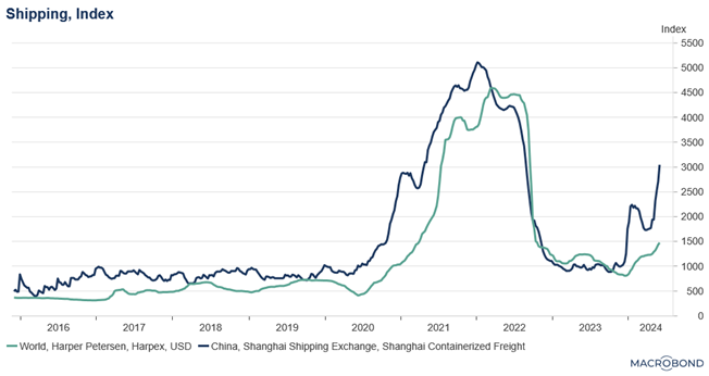 Dernier point d’attention, qui dit reprise dans l’industrie, et en tenant compte du fait que les navires continuent, dans la majorité, d’éviter la mer Rouge, ce qui rallonge le trajet, les coûts des transports ont très nettement augmenté, en particulier en Asie.