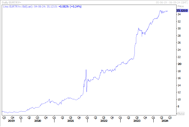 Pour la livre turque par rapport à l’euro, comme le montre le graphique, suite à une hausse de l’inflation, des prix à la production et une baisse de l’indice PMI manufacturier.