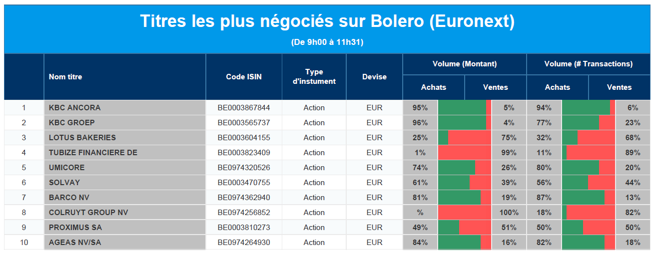 Chaque jour, nous vous offrons un aperçu des titres les plus négociés chez Bolero sur Euronext. Idéal pour prendre la température du marché boursier et pour découvrir les actions ou les titres que les autres investisseurs s'arrachent !