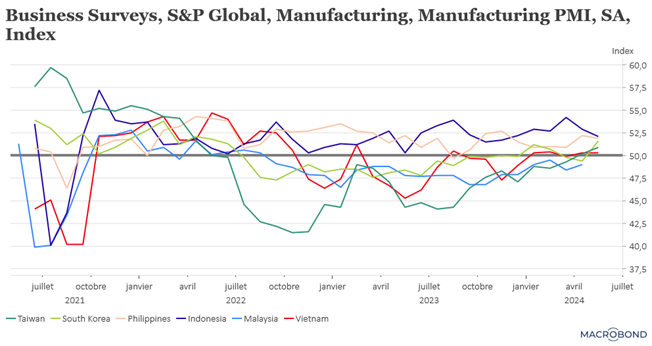 Et comme le montre le graphique, les indices PMI manufacturiers ont progressé à Taïwan, en Indonésie, au Vietnam et aux Philippines.