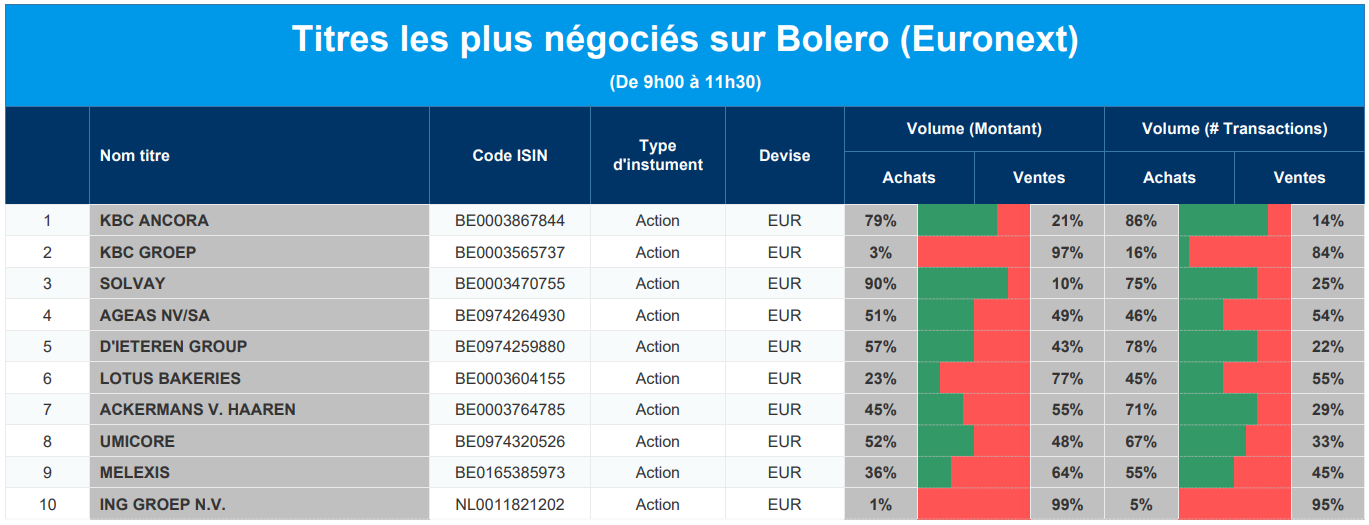 Chaque jour, nous vous offrons un aperçu des titres les plus négociés chez Bolero sur Euronext. Idéal pour prendre la température du marché boursier et pour découvrir les actions ou les titres que les autres investisseurs s'arrachent !